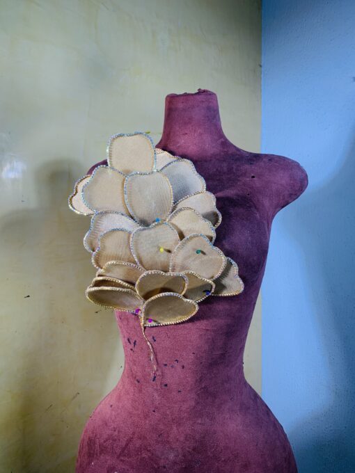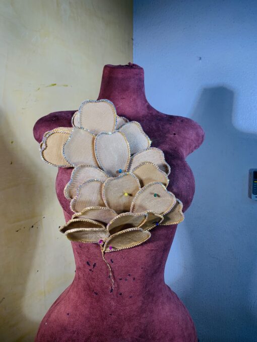 A well detailed 3D Applique with a Gold contouring for bodice overlay or a dramatic shoulder piece also perfect for decorating evening gowns, bridal couture or statement Fashion pieces