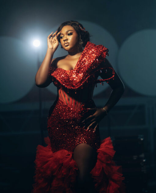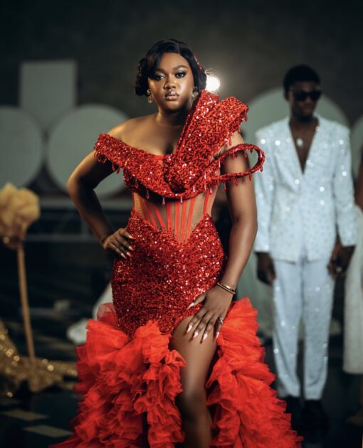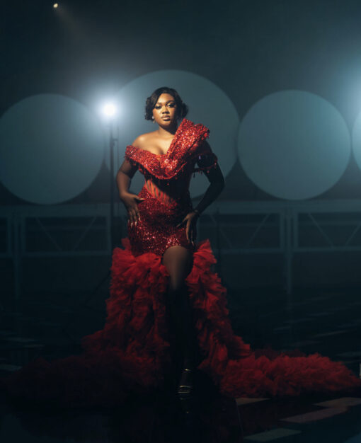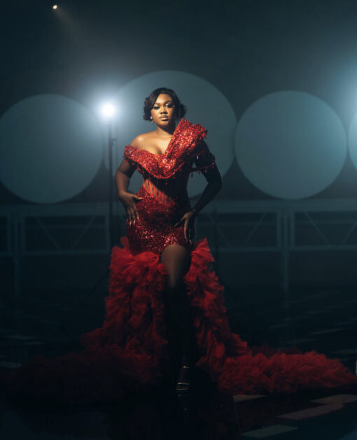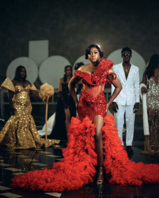 This striking red gown features a bold, corset-style bodice adorned with intricate beadwork, accentuating a dramatic silhouette. The high slit adds a daring touch, while the voluminous tulle creates a captivating, flowing effect. This show-stopping dress is ideal for those looking to make a powerful impression at formal events, exuding confidence and sophistication.