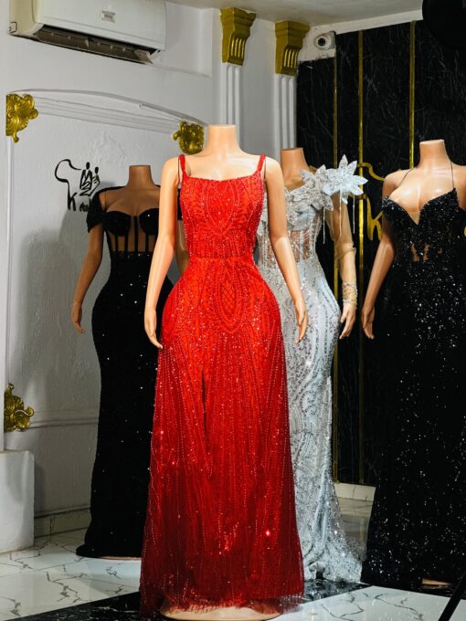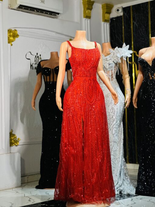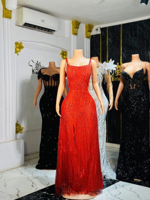 Ethereal Elegance: An elegant red dress for evening event. Make an unforgettable entrance in this breathtaking prom dress, customizable to your perfect fit .