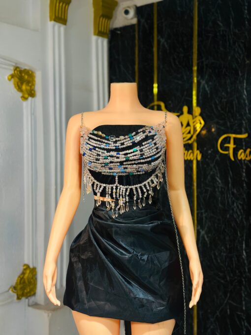 Elevate your look with the crystal Rain Beaded top a captivating handmade piece that shimmers with elegance edge. This unique top is intricately crafted with layers of glass beads in clear, silver and blue tone, draping beautifully across the bust in cascading dangling crystal drops that move like rainfall, catching the light with every step