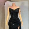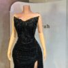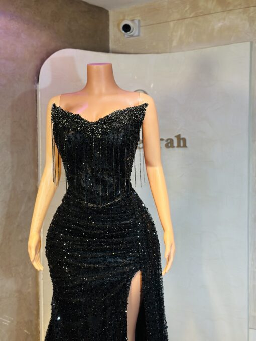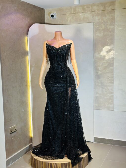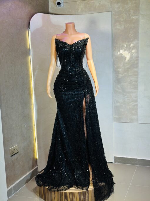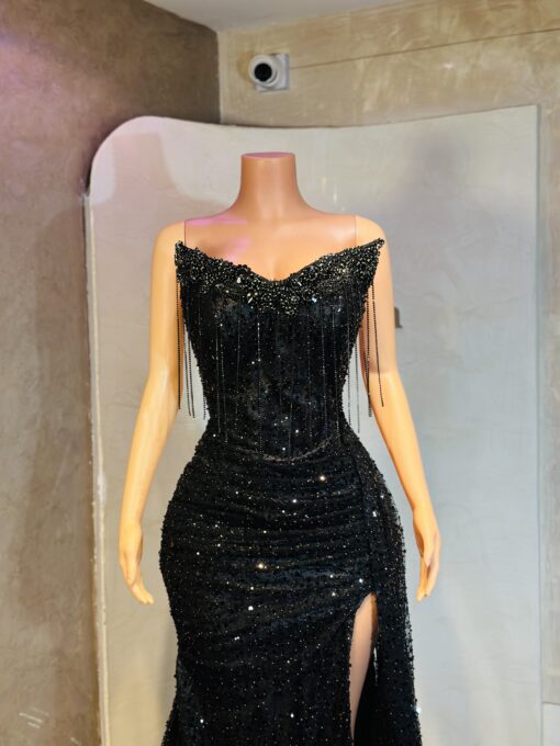 Ethereal Elegance: Customizable black lace prom dress with stone embellishment. Make an unforgettable entrance in this breathtaking prom dress, customizable to your perfect fit .