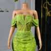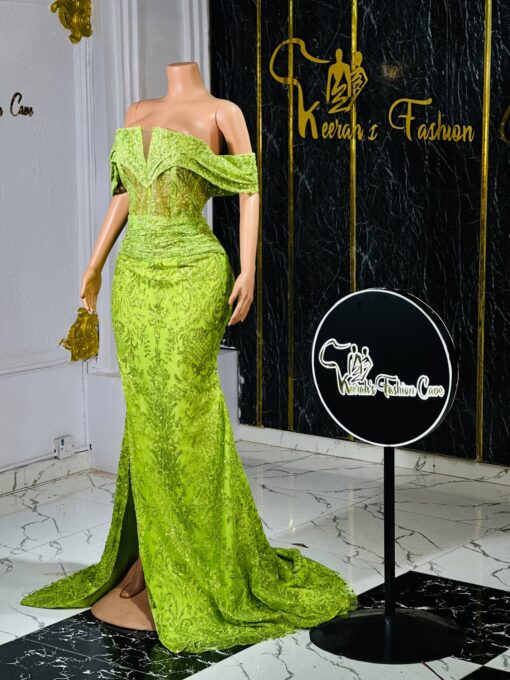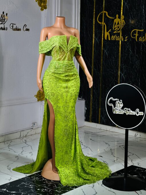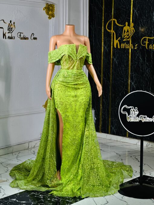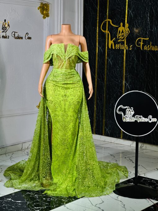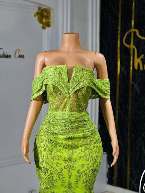 Make a breathtaking entrance in this exquisite, floor-length green lace gown. The off-the-shoulder design adds a touch of romance and whimsy, while the delicate lace details create a sense of ethereal beauty.
