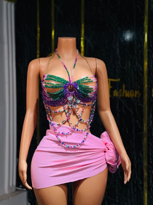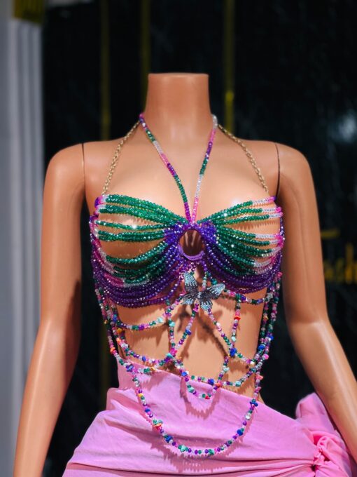 100% handmade bead construction, fully structured with beads and chains, colorful mix of glass beads for high shine texture bold and breathable