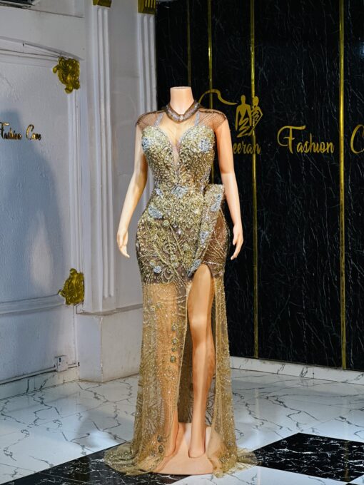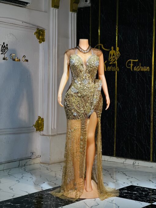 Ethereal Elegance: luxurious see through gold dress with structured sleeves . Make an unforgettable entrance in this breathtaking prom dress, customizable to your perfect fit .